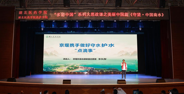 一城春色半城水,青山入眼皆成画。9月25日,湖北医药学院特别策划制作的“多彩中国”系列大思政课之美丽中国篇《守望·中国南水》在该校学子会馆三楼倾情开讲。来自京堰两地的高校教师、志愿者、企业家、农民、思政辅导员、理论宣讲员等各行各业人士登上该校大思政课讲台,为2000余名师生讲述了南水北调中线工程通水10周年来,京堰人民守护绿水青山、护好一库净水,将大爱融入一泓清水的动人篇章。