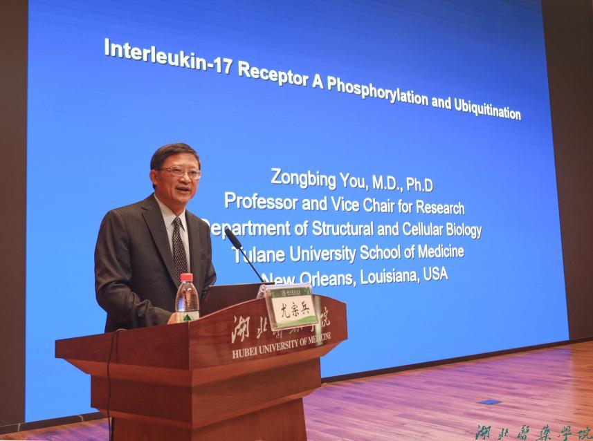 座谈会后,尤宗兵教授为我校师生做题为《白介素-17受体A的磷酸化和泛素化》的学术报告。他详细介绍白介素-17与前列腺癌的关系、肥胖与前列腺癌的关系以及白介素-17受体A的磷酸化和泛素化,与师生互动热烈。