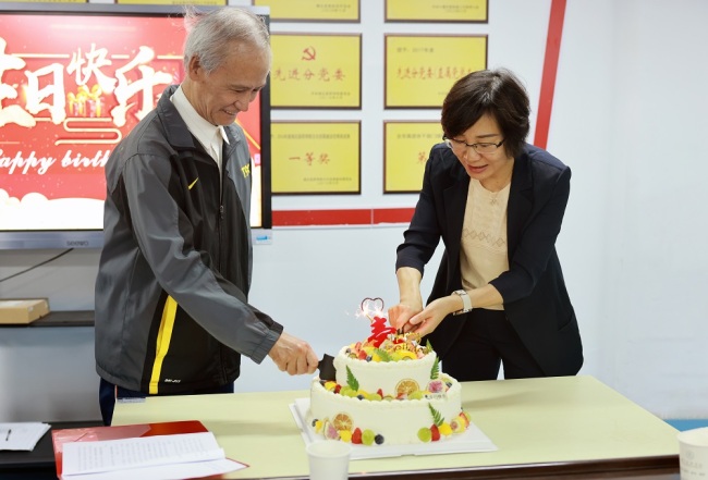 80岁寿星廖广照老师分享自己的长寿秘诀和人生感悟,表达对校党委长期以来关心支持的感激之情,表示将继续发挥余热,为学校的发展建设贡献自己的力量。
