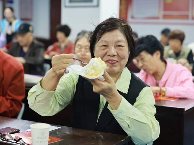 郑丹凤和老寿星代表同切蛋糕,大家一边品尝美味,一边欣赏离退休银龄葫芦丝队吹奏的《生日快乐歌》,生日会热烈而温暖,氛围感十足。