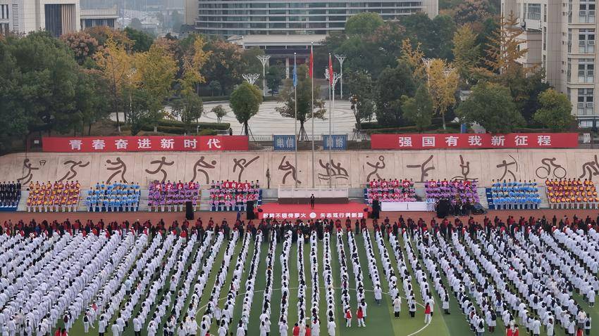 早上7点10分,湖北医药学院田径运动场上花海翻涌、歌声悠扬。全体校领导、历任校领导、市内附属医院领导班子成员、离退休老领导、校友代表、学生代表以及教职工代表等共上千名师生齐聚于此,参加“躬耕不辍传薪火,矢志笃行谱新篇”59周年校庆主题升旗仪式暨建校60周年庆典倒计时一周年启动仪式。