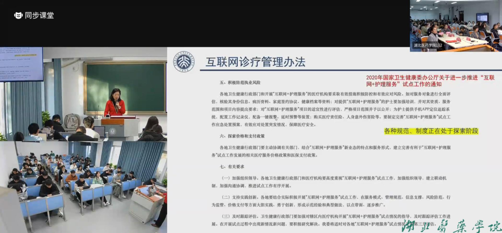 启动仪式结束后,北京大学护理学院与我校护理学院师生共同聆听了北京大学吴雪老师精彩的讲授。吴雪围绕线上挂号、远程护理、移动护理等内容,讲解了新时代互联网在护理领域的创新应用,着重介绍了传送机器人、智能手环、线上小程序等应用。课堂上,运用智慧树平台和线上英文课程资源(Nursing Informatics)等多种信息化教学手段,参加活动的师生积极参与互动,分享自己的观点和经验,使教学更加生动。吴雪带领我校《护理信息学》授课教师张振桐、曹琼雅,一同组织现场测试,引导两校近200名学生共同讨论和巩固知识,加深对数字化、信息化对护理领域影响的认识。尽管相隔千里,相聚云端,但学生全程积极参与,课堂气氛热烈。