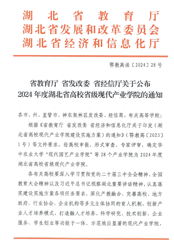 本网讯(通讯员 张艳)近日,湖北省教育厅、省发改委、省经信厅联合下发《关于公布2024年度湖北省高校省级现代产业学院的通知》(鄂教高函[2024]28号),我校由教务处负责组织、药学院牵头建设并申报的武当生物医药健康产业学院顺利获批,这是我校获批的首个省级现代产业学院。