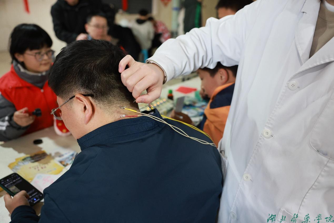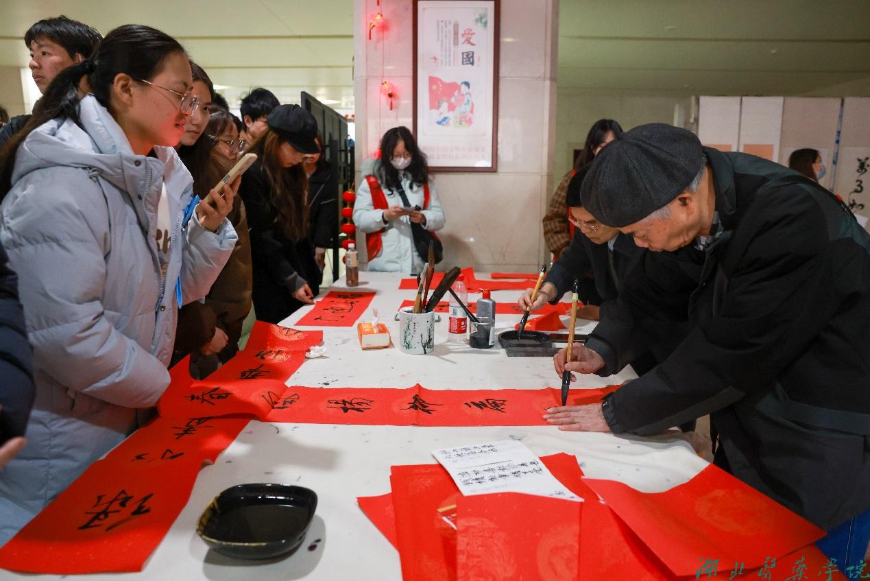 此次嘉年华活动中,除了由各学院社团和离退休老教师奉上的合唱、歌舞、电吹管、葫芦丝、口琴等多姿多彩的节目“大餐”外,湖北医药学院还将活动现场打造成了一条充满传统文化与现代趣味的文化街区。现场共开设了25个摊位,剪纸、烙画、漆扇、投壶等非遗互动展示,康复理疗、推拿、耳穴等康复项目体验,武当中草药水晶标本、腊叶标本等自然科普展示,蛋糕、糖葫芦、襄阳牛肉面等丰富美食品尝,点歌、彩绘、心理游戏等趣味解压体验,猜灯谜、对唐诗、编织中国结等年味退休教职工现场书写春联送春联……师生们手持“集福卡”专属明信片在各个摊位参与体验,集福签盖印章。