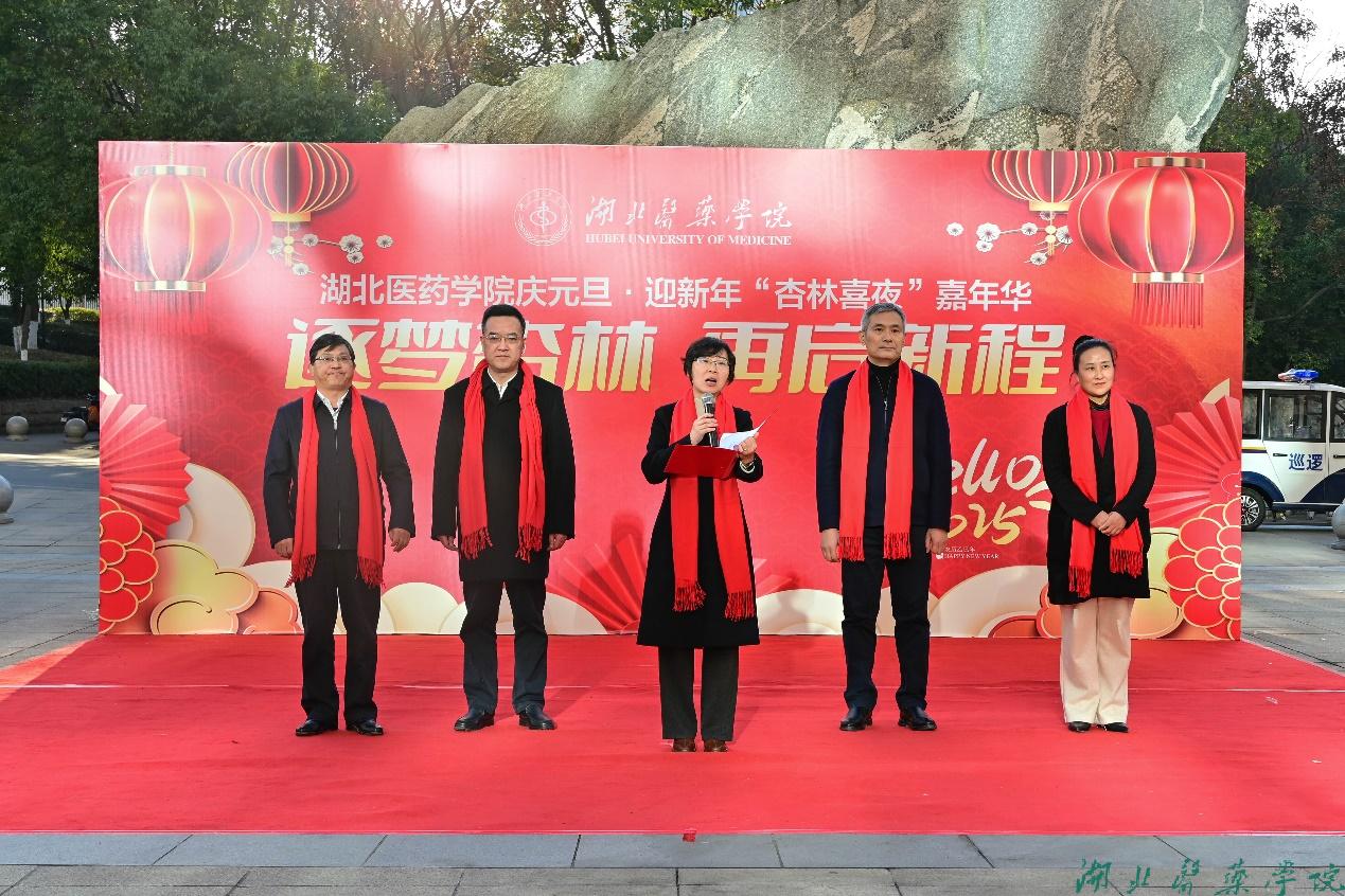民乐合奏《金蛇狂舞》、独唱《好运来》、舞蹈《迎春》等节目拉开了本次嘉年华活动的帷幕。开幕式上,湖北医药学院党委书记郑丹凤发表新年献词,表示“2025年,是湖北医药学院建校60周年,我们将以‘甲子一梦,圆梦今朝’的志气与干劲,深化质量立校、人才强校、特色兴校,深化内涵建设、条件建设和队伍建设,续写高质量发展新篇章,再创新辉煌。”校领导徐荣、张海蛟、谭艳也分别送上新年祝词,共同祝愿全校师生新年快乐。党委副书记、校长罗杰宣布湖北医药学院庆元旦·迎新年“杏林喜夜”嘉年华活动开幕。