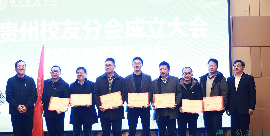 湖北医药学院党委副书记张海蛟,原党委书记、校友会名誉会长涂汉军共同为贵州校友分会授旗并颁发聘书。