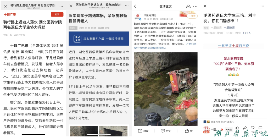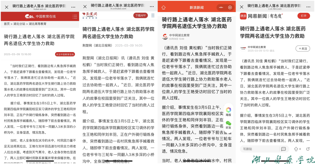 本网讯(通讯员 黄兆辉)近日,我校第四临床学院退伍大学生王艳、刘丰羽骑行路上勇救落水老人事迹受到社会广泛关注。中国教育在线、荆楚网(湖北日报网)、极目新闻、凤凰网湖北、十堰晚报、十堰广电传媒、汉水襄阳、十堰文明网等多家媒体相继进行了关注报道