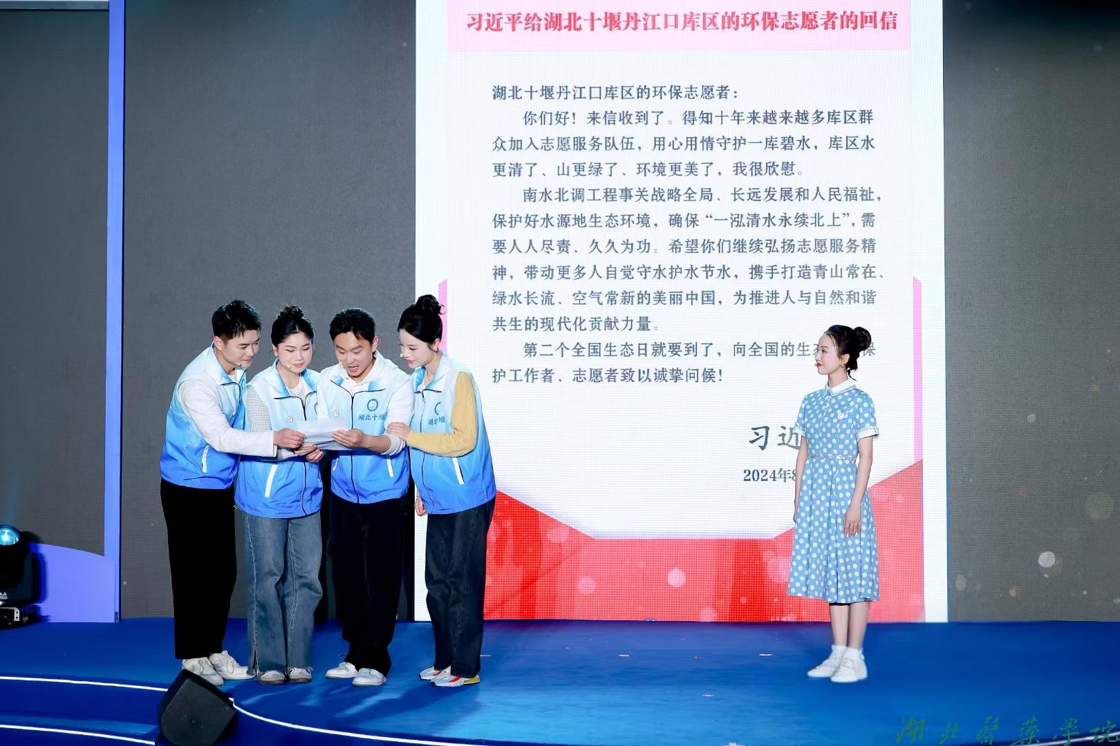 在北京主会场,我校青年志愿者卢子宁作为唯一高校代表,参演了原创节水主题舞台剧《小水滴的旅行》。该剧以拟人化的手法生动演绎了南水北调的宏大工程,从孩子们的朗朗读书声到志愿者们清理河道的场景,将“珍惜每一滴水”的环保理念展现得淋漓尽致,同时传递了节水护水的科学知识,赢得了现场观众的阵阵掌声。