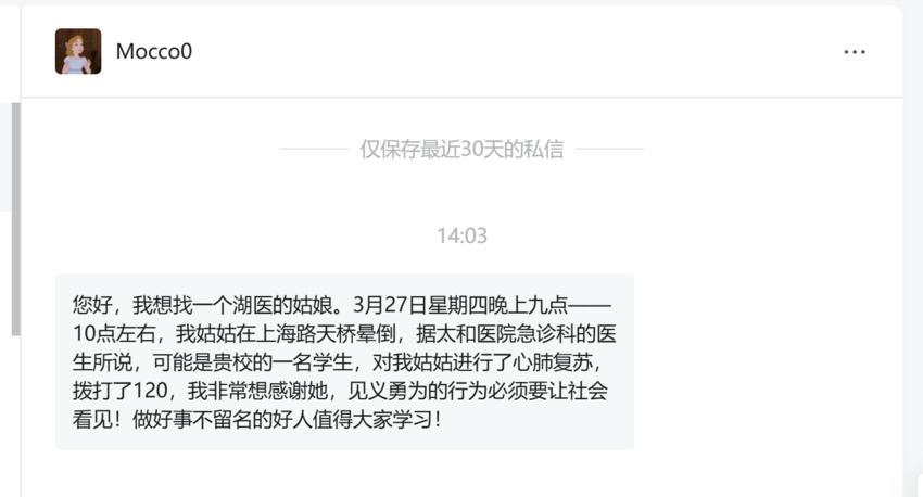 事后,患者家属通过医院得知施救者为湖医药学生,联系校方并表达感激:“见义勇为的行为必须被看见!这样的好人值得全社会学习!”