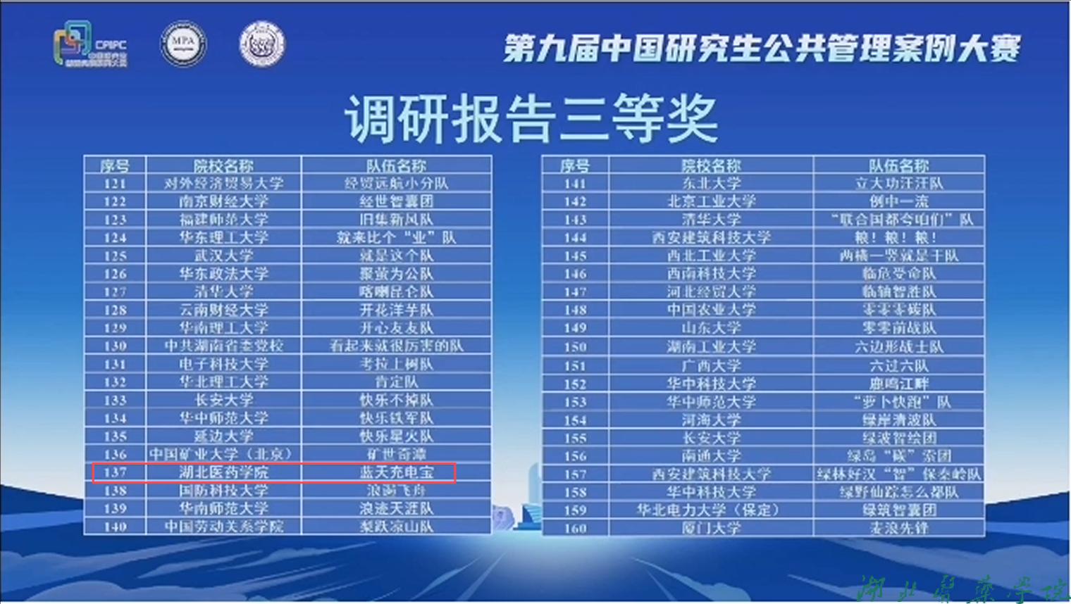 中国研究生公共管理案例大赛属于“中国研究生创新实践系列大赛”的主题赛事之一,也是公共管理学科类唯一上榜的权威赛事。自2016年创设以来,该项赛事认可度和影响力与日俱增,已成为我国公共管理高等教育领域的品牌赛事。公卫学院对此次大赛高度重视,赛前作了精心安排,组织了MPA专业研究生参加培训,导师带队赴基层开展现场调研,聘请专家指导,反复打磨案例文本。学院将深刻总结本次参赛经验,继续强化专业学位研究生的实践能力培养,以赛促培,大力推动公共管理、图书情报、公共卫生专业的研究生积极参加各类专业赛事。以比赛为重要载体,引导研究生密切关注现实问题,不断提升运用理论与方法论解决实际问题的专业能力。