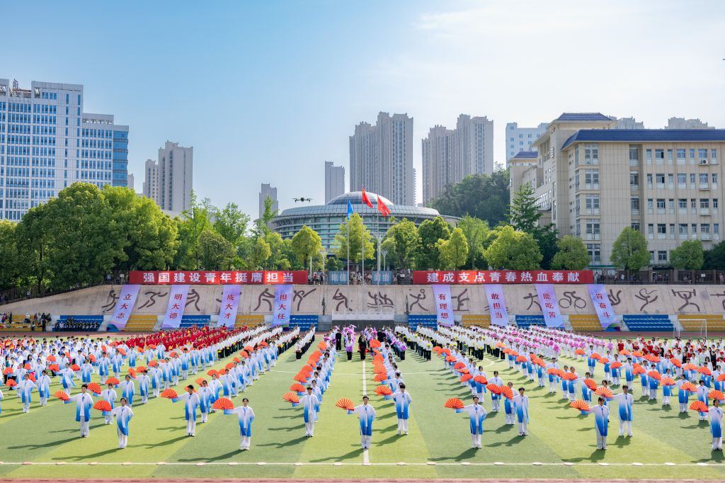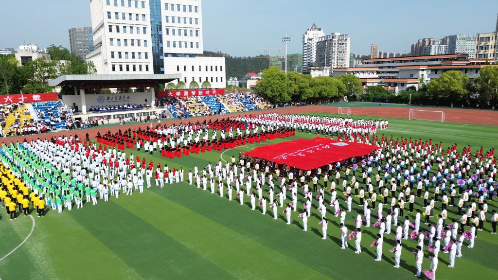 大型表演《六秩春华育桃李 服务支点建新功》为现场师生带来了一场精彩的视听盛宴,将现场氛围推向高潮。表演第一篇章为杏林芳华。其中,太极扇表演《象王行》中,130名学生手持红扇,以刚劲有力的武术动作配合着激昂的鼓点,整齐划一地展现出武术的阳刚之美;伞舞《破阵乐》则以优美的舞姿和灵动的伞花变化,将力量与柔美完美融合;街舞《哪吒》以充满活力的动作和富有感染力的音乐燃爆全场;第二篇章甲子弦歌中,朗诵与歌舞相结合,回顾了学校六十年来的风雨历程。巨幅校旗在队伍上方惊艳亮相,表演者摆出“60”数字,表达对学校建校60周年的热爱与祝福。第三篇章赤子丹心中,汉族、藏族、土家族等多民族学生演唱歌曲《我的家》,唱响民族团结赞歌。