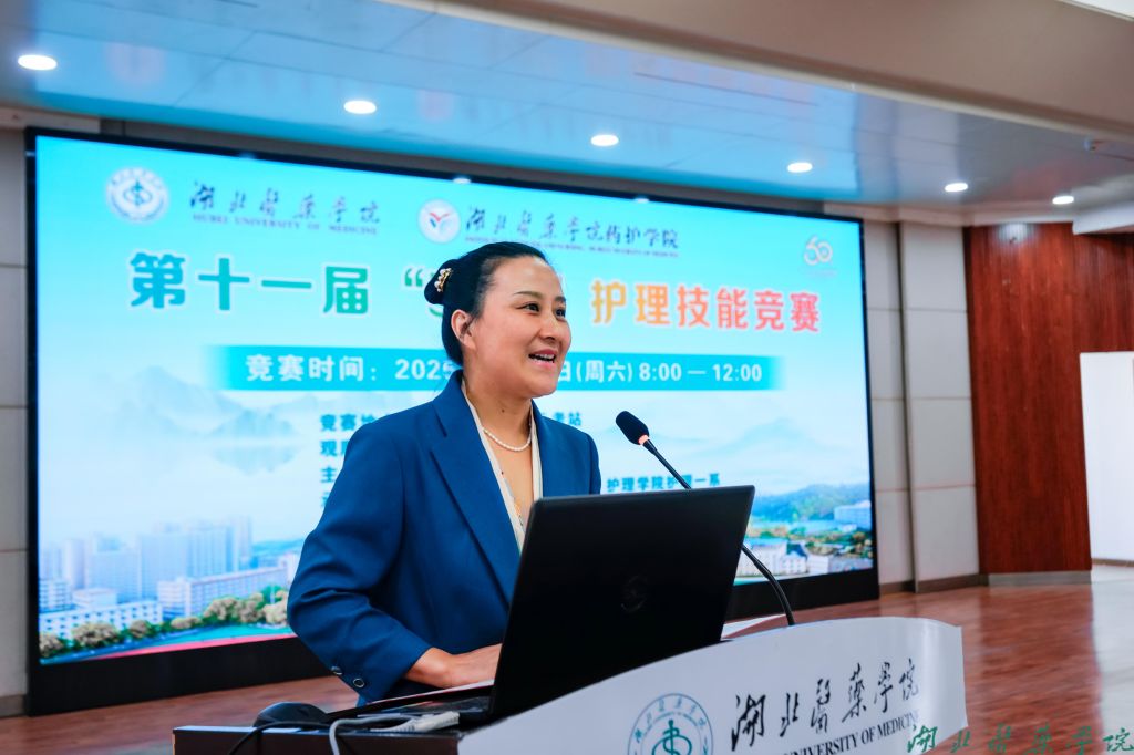 校党委常委、副校长、统战部部长谭艳出席大赛开幕式并致辞。她指出,护理技能大赛是适应新时代护理事业发展需求、培养学生的重要契机,并强调了数字化与智能化技术在护理领域的应用及个性化服务的重要性。她希望参赛选手展现专业风采、遵守规则、注重团队协作;指导教师精心指导、关注学生全面发展;评委公正评判、给予专业指导。谭艳副校长的讲话为大赛提供了明确方向和有力保障。
