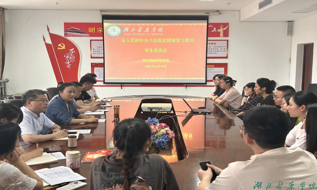 本网讯(通讯员 彭孟琦)5月19日下午,第五临床学院在科教楼408会议室召开深入贯彻中央八项规定精神学习教育学生座谈会。党委常委、副校长谭艳出席并讲话,会议由第五临床学院党委书记陈飞主持。第五临床学院各职能部门负责人及毕业班级学生代表参会。