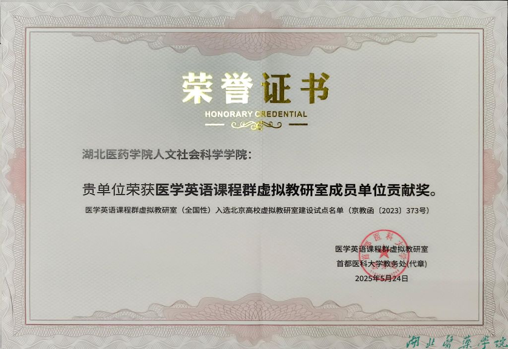 本网讯(通讯员 薛军锋)5月24日,我校人文社会科学学院外语课部收到来自首都医科大学的好消息。湖北医药学院人文社会科学学院获医学英语课程群虚拟教研室(全国性)成员单位贡献奖。