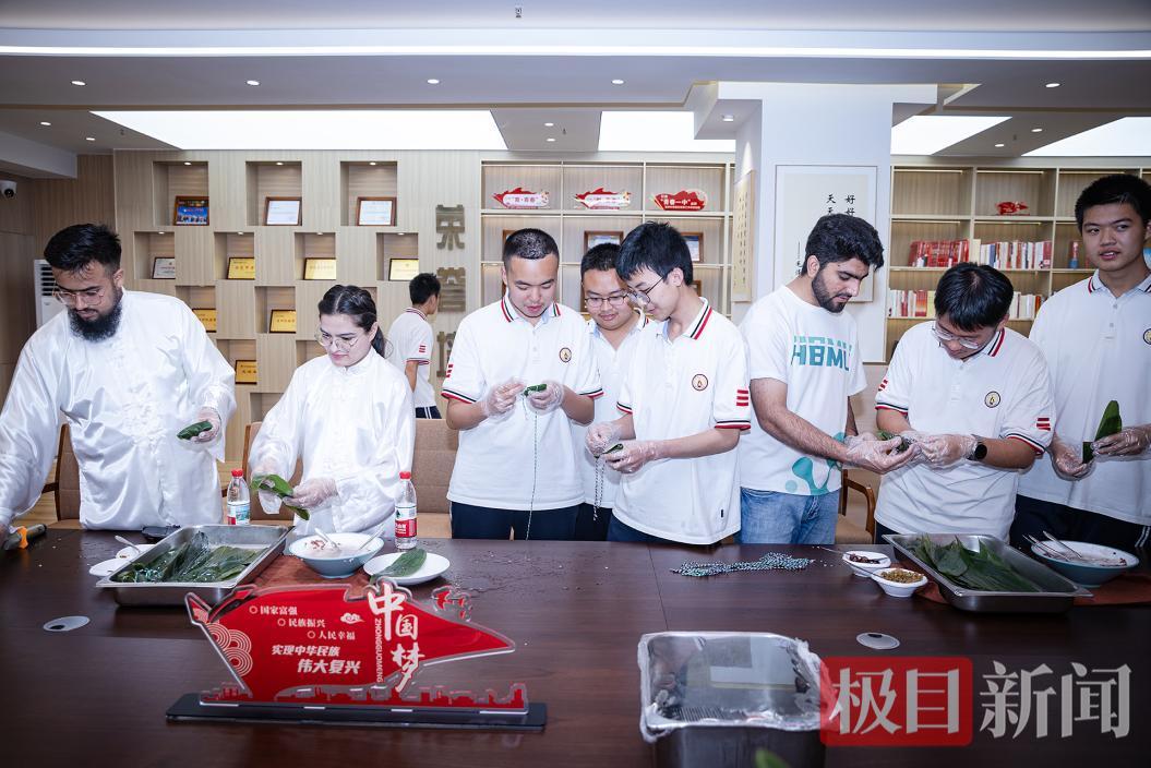 最具烟火气的包粽子环节将活动推向高潮。中外学生分组协作,从粽叶折叠、糯米填充到棉线缠绕,在手把手教学中感受端午民俗的温度。来自巴基斯坦的留学生卡米表示:“第一次包粽子很有趣,原来每一片粽叶都包裹着中国文化的味道。”
