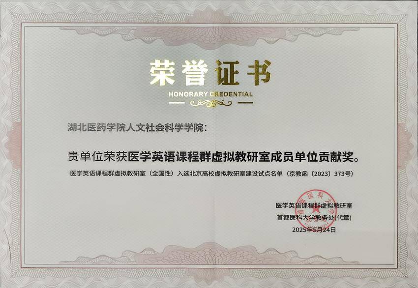 湖北日报客户端讯(通讯员 薛军锋)5月24日,湖北医药学院传来喜讯,该校人文社会科学学院外语课部获医学英语课程群虚拟教研室(全国性)成员单位贡献奖。