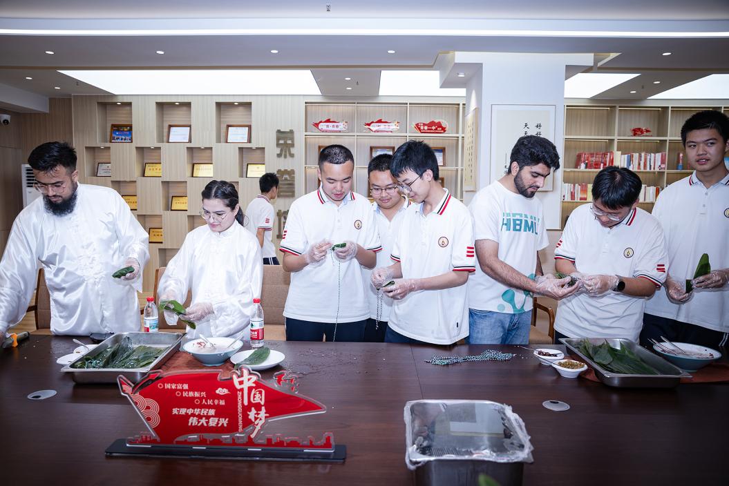 最具烟火气的包粽子环节将活动推向高潮。中外学生分组协作,从粽叶折叠、糯米填充到棉线缠绕,在手把手教学中感受端午民俗的温度。来自巴基斯坦的留学生卡米表示:“第一次包粽子很有趣,原来每一片粽叶都包裹着中国文化的味道。”