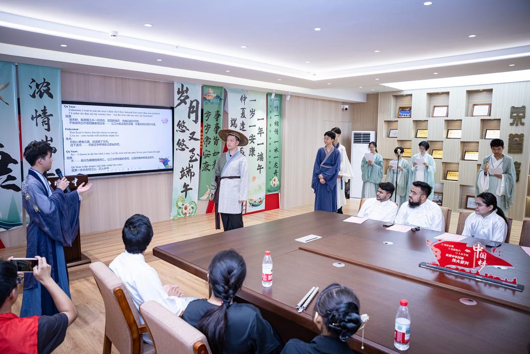 作为活动发起方与组织者,湖北医药学院人文社会科学学院外语课部充分发挥学科优势,将语言教学与文化传播深度融合。外语课部负责人傅珏老师介绍:“此次活动是‘用外语讲好中国故事’的教学实践。从指导学生用英语诠释端午文化,到引导留学生通过武术表演实现文化转译,本质上是培养‘既有中国心、又有世界眼’的复合型人才。” 两校后续将围绕武当文化、汉水文明等地域特色,开发大中小学贯通的外语课程思政校本资源,推动文化交流常态化。