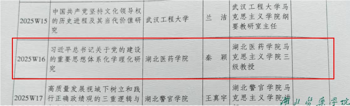 本网讯(通讯员 肖飞)近日,中共湖北省委党的建设工作领导小组办公室、湖北省党的建设研究会联合发文,公布了2025年湖北省党建研究立项课题名单,我校马克思主义学院秦颖教授主持申报的自选课题《习近平总书记关于党的建设的重要思想体系化学理化研究》获批立项(项目编号:2025W16)。今年全省169家单位推荐申报374项党建课题,经组织审核、专家评审、综合研判,决定对167项课题予以立项。其中重点课题12项、委托课题16项、专项课题105项、自选课题34项。