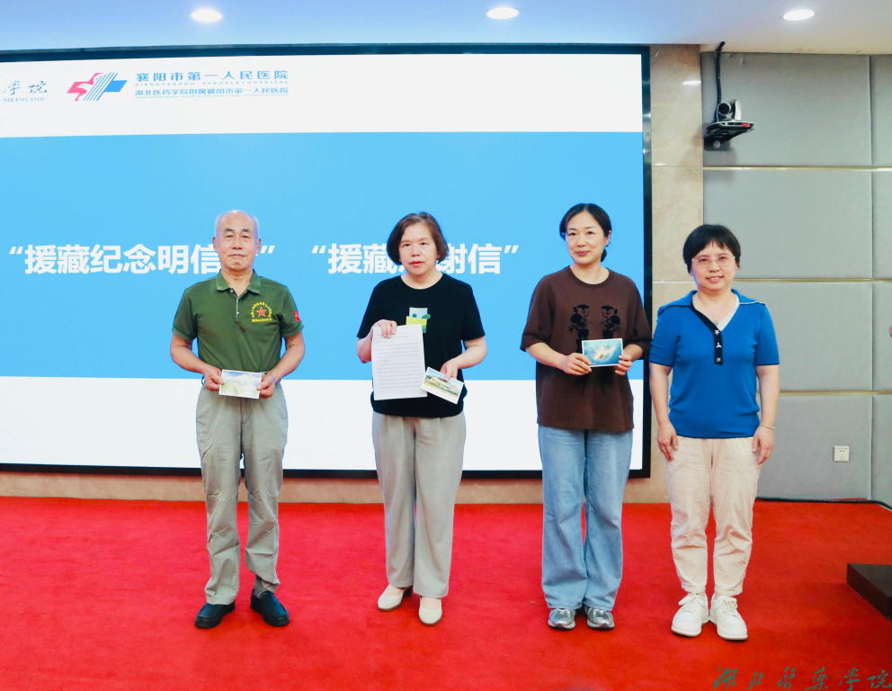附属襄阳市第一人民医院副院长、第四临床学院副院长焦蓉为蒋克昌、刘敏、郭广林三位援藏队员颁发由当地学生手写寄来的“援藏纪念明信片”,并向郭广林送上“援藏感谢信”,对他们在雪域高原的长期坚守与无私奉献表示感谢。随后,蒋克昌、郭广林、谭志彬三位援藏队员代表分享在西藏琼结开展医疗援藏工作的难忘经历。他们克服高寒缺氧、语言障碍等重重困难奔赴雪域高原,以精湛的医术无私守护西藏地区民众的生命安全和身体健康,用实际行动诠释了“医者仁心、大爱无疆”的济世情怀。