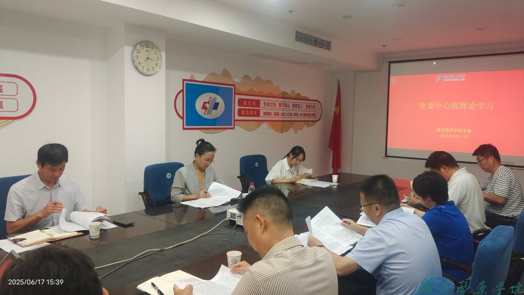 本网讯(通讯员 白宝鑫)6月17日下午,第四临床学院6月份党委理论学习中心组集中学习、党委会与党政联席会议在附属襄阳市第一人民医院323会议室召开。校党委常委、副校长、统战部长谭艳率督导组到会督导。第四临床学院党委书记赵国新主持会议。学院党委领导班子全体成员参加会议。