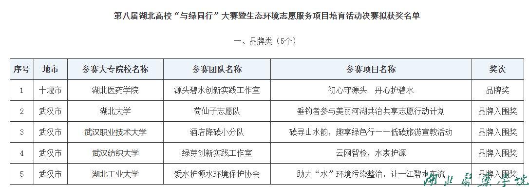 本网讯(通讯员 张垚)6月15日,第八届湖北高校“与绿同行”大赛暨生态环境志愿服务项目培育活动决赛在武汉市举办,我校源头碧水创新实践工作室申报项目“初心守源头丹心护碧水”获得本次比赛唯一一个品牌奖。