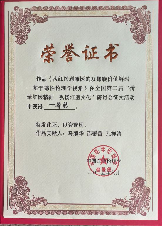 此次获奖为深化“医廉”课题研究,构建红医育人体系提供新思路新方法,推动我校医学伦理学研究和发展,让红医精神在新时代绽放更加耀眼的光芒。(审核 孔祥清)