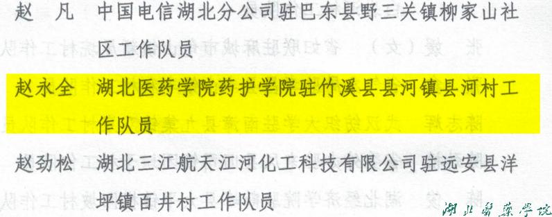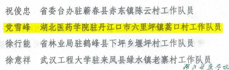 据悉,此次期满考核按23%的比例评选,全省仅有114名驻村工作队员获通报表扬。党雪峰、赵永全两位同志获此荣誉,既是对他们个人扎实工作的充分肯定,也是对我校助力乡村振兴工作的积极鼓励。湖北医药学院及药护学院驻村工作队将珍惜荣誉、再接再厉,持续发挥高校人才和资源优势,扎实做好驻村帮扶工作,为推动乡村全面振兴不断作出新贡献。(审稿 张秋莉)