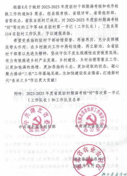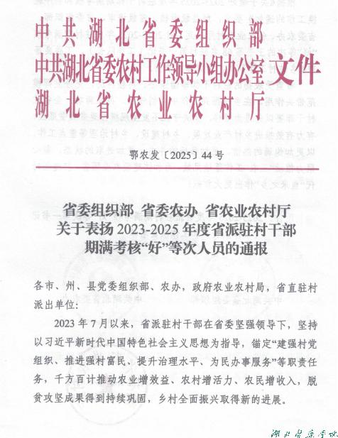 本网讯(通讯员 李亚君)近日,中共湖北省委组织部、省委农村工作领导小组办公室、省农业农村厅联合印发《关于表扬2023-2025年度省派驻村干部期满考核“好”等次人员的通报》(鄂农发〔2025〕44号),对在全省乡村振兴工作中表现突出的驻村干部予以通报表扬。湖北医药学院驻丹江口市六里坪镇蒿口村工作队员党雪峰、湖北医药学院药护学院驻竹溪县县河镇县河村工作队员赵永全两位同志双双荣获期满考核“好”等次评价。