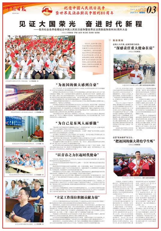 9月3日,纪念中国人民抗日战争暨世界反法西斯战争胜利80周年大会在北京天安门广场隆重举行。我市社会各界通过多种形式收听收看直播,来自我市的全国人大代表、全国劳动模范王建清,全国“最美教师”彭玉生受邀在天安门现场观礼,铭记先烈伟绩,感受祖国强大,传承伟大抗战精神,凝聚奋进新征程的磅礴力量。