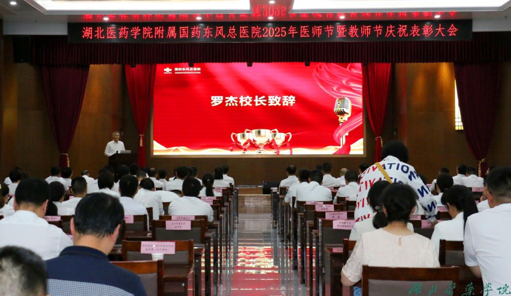 本网讯(通讯员 毛宏灵)9月8日下午,我校附属国药东风总医院成功举办2025年医师节暨教师节表彰大会。大会旨在总结2024 - 2025学年附院教育教学工作成果,激励全体教师爱岗敬业,潜心教学科研,不断提高学校人才培养质量。湖北医药学院党委副书记、校长罗杰出席大会并致辞,国药东风总医院党委书记王翔宇作总结讲话,国药华中、国药东风医疗健康产业公司、国药东风总医院全体领导班子成员出席大会,会议由附属国药东风总医院副院长、第二临床学院副院长周文波主持。