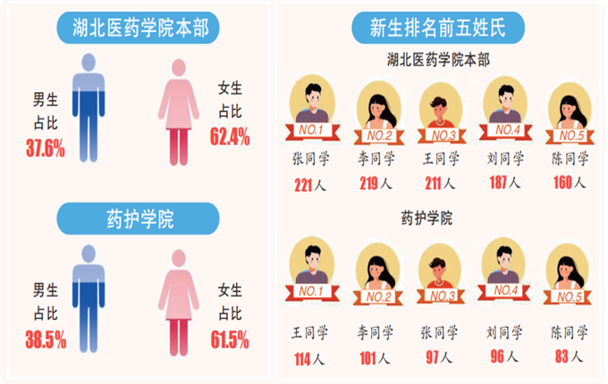 哪个姓氏新生最多?湖北医药学院本部新生排名前五姓氏为张、李、王、刘、陈,药护学院新生排名前五姓氏为王、李、张、刘、陈。