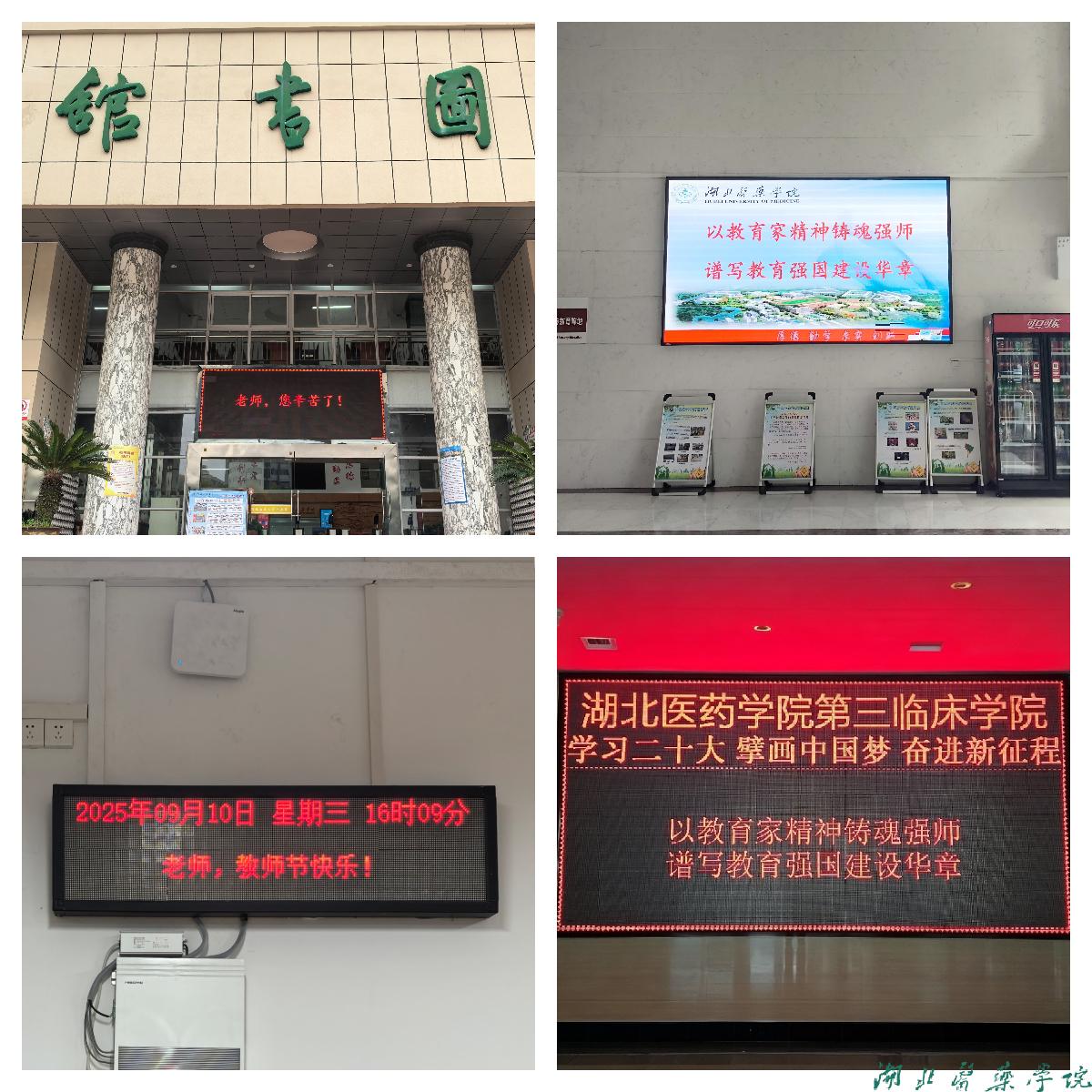 学校教学楼、图书馆、各二级学院和附属医院,随处可见户外展览、电子屏幕展示播放“以教育家精神铸魂强师,谱写教育强国建设华章”“赓续六十载精神血脉,争当新时代湖医药‘教育家’”“热烈庆祝第41个教师节”“老师,教师节快乐”“老师,您辛苦了”等祝福语,温暖的话语传递出尊师重教的力量,引得师生们纷纷驻足观看。