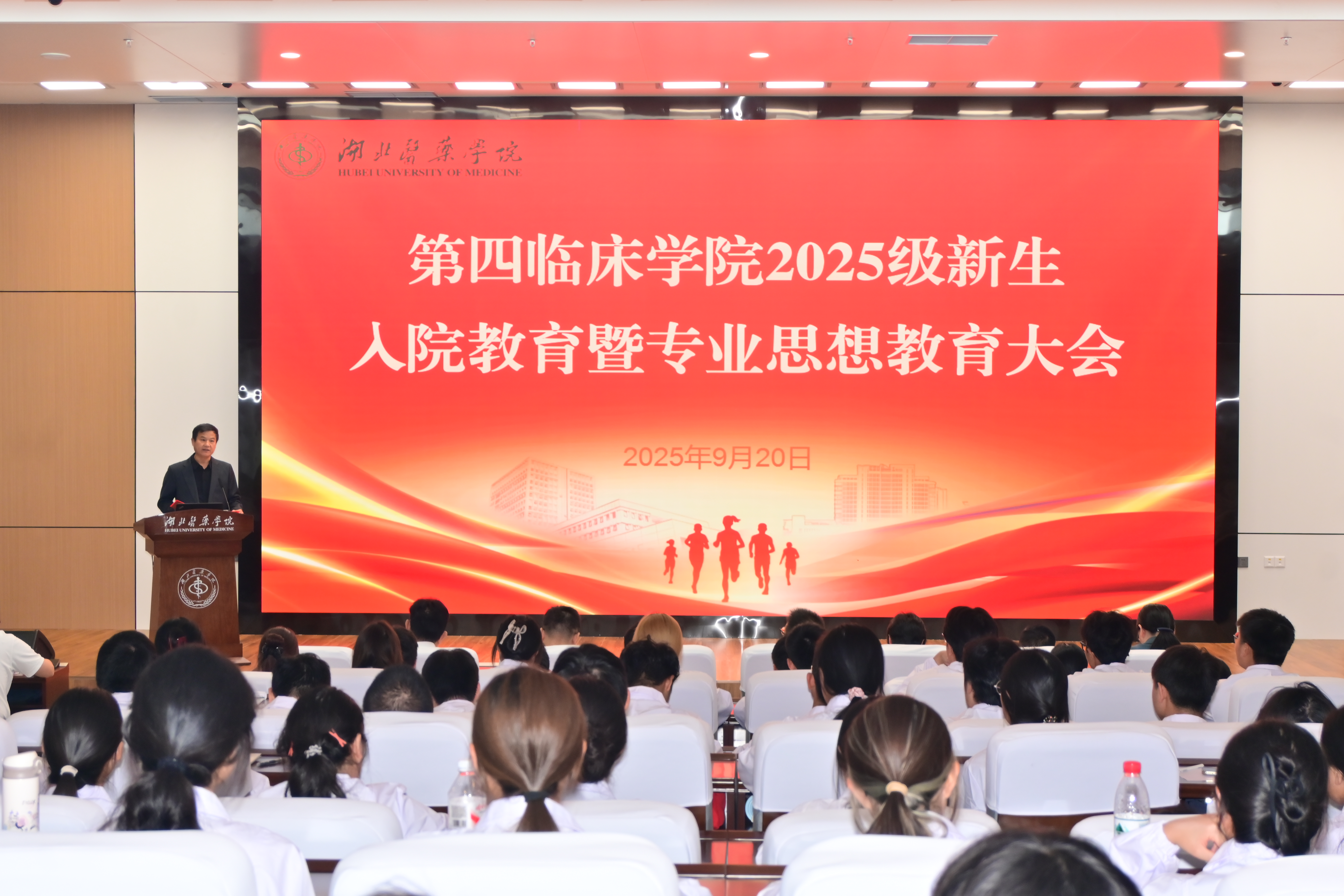 本网讯(通讯员 郑雯艺 龙月娇)9月20日下午,第四临床学院在公卫大楼二楼学术报告厅召开2025级新生入院教育暨专业思想教育大会。第四临床学院院长周卫兵,党委书记、常务副院长赵国新,党建组织员李贵华,副院长焦蓉、桑明、杨军、刘岳、党委委员周静然出席大会,十堰校区全体教师、2025级全体新生参加会议。本次会议由郑建超主持。