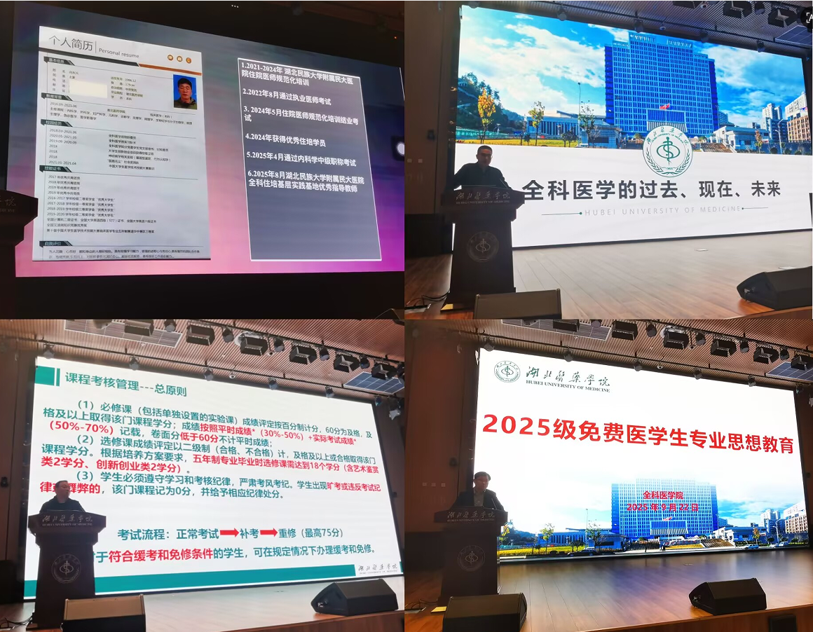 本网讯(通讯员 程钧)9月22日晚,2025级免费医学专业思想教育大会在公卫楼一楼多功能厅举行。全科医学院领导及相关科室负责人、我校优秀校友2016级免费医学生向永兴、2025级全体免费医学生参加本次活动。学院党委副书记杨靖主持会议。