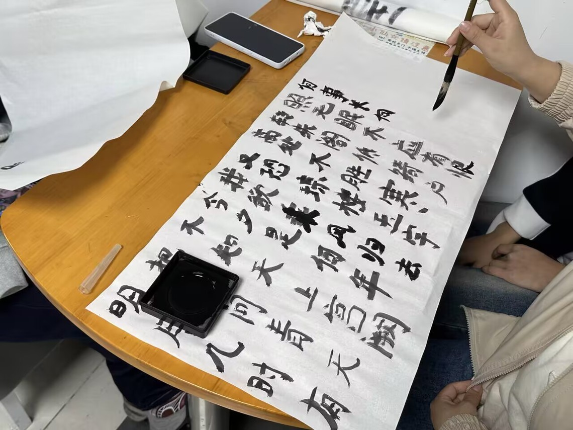 活动在“诗诵中秋·声动明月”中拉开帷幕。各族学子同台演绎,或独诵或合诵,深情吟咏《水调歌头·明月几时有》等经典诗词。“灯谜猜字·智趣共赏”环节妙趣横生。悬挂的中秋灯谜盲盒涵盖诗词典故,吸引各族学子与社区居民热情参与。大家在破解谜题中交流智慧,在欢声笑语中增进情谊。“执笔书情·墨韵中秋”环节,备齐的兼毫、墨碟与宣纸让参与者尽情挥毫,不同民族背景的学子共同执笔,或临摹经典诗句,或书写佳节祝福,将活动推向高潮。