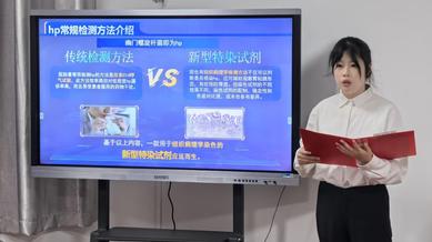 答辩环节,13个参赛项目依次展示,作品覆盖新型组织染色试剂、原创生物制剂、靶向治疗探索以及智慧医疗硬件等领域。团队通过项目背景、创新思路、实验设计以及研究成果等方面进行汇报,展现出扎实的专业基础,尽显学子创新力。评委老师围绕项目的创新性、科学性和可行性,与参赛同学进行了深入交流,就实验设计、成果转化等关键问题提出了建设性建议,为项目的进一步完善指明方向。