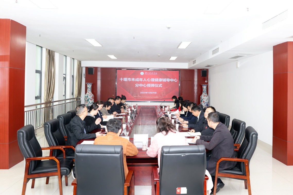 本网讯(文/扶长青 图/郑语晨)10月29日,十堰市未成年人心理健康辅导中心分中心授牌仪式在科教楼1708会议室举行,十堰市城市文明创建中心、市创文办副主任安小莉,校党委书记郑丹凤,校党委常委、宣传部部长陈建龙出席仪式。