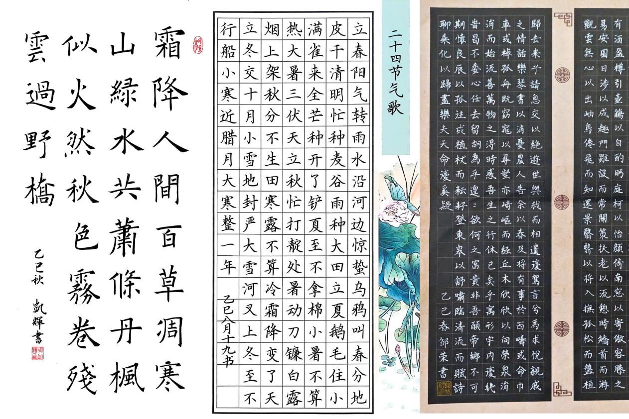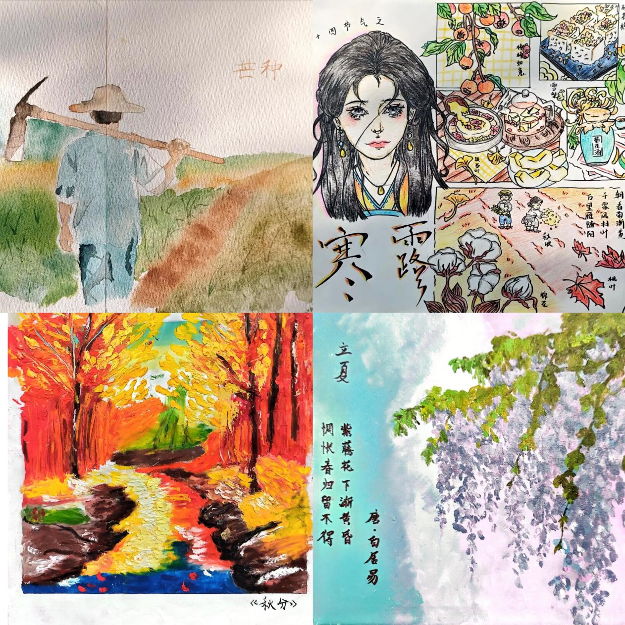 绘画组作品中,有写实风格下“芒种农耕”的生活场景,也有充满想象力的“寒露仙子”艺术演绎,素描、水彩、板绘等多种形式尽显创意;书法组作品里,软笔遒劲有力,硬笔娟秀工整,同学们书写与节气相关的诗词、谚语,既展现书法功底,又传递节气内涵,每一份作品都是对传统文化的理解与热爱。