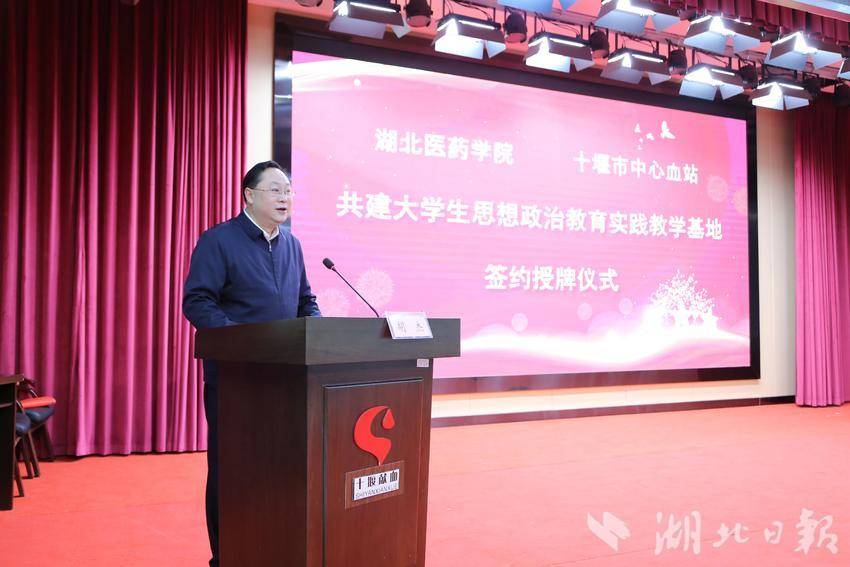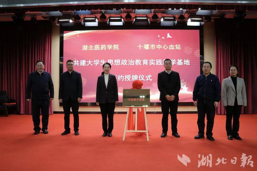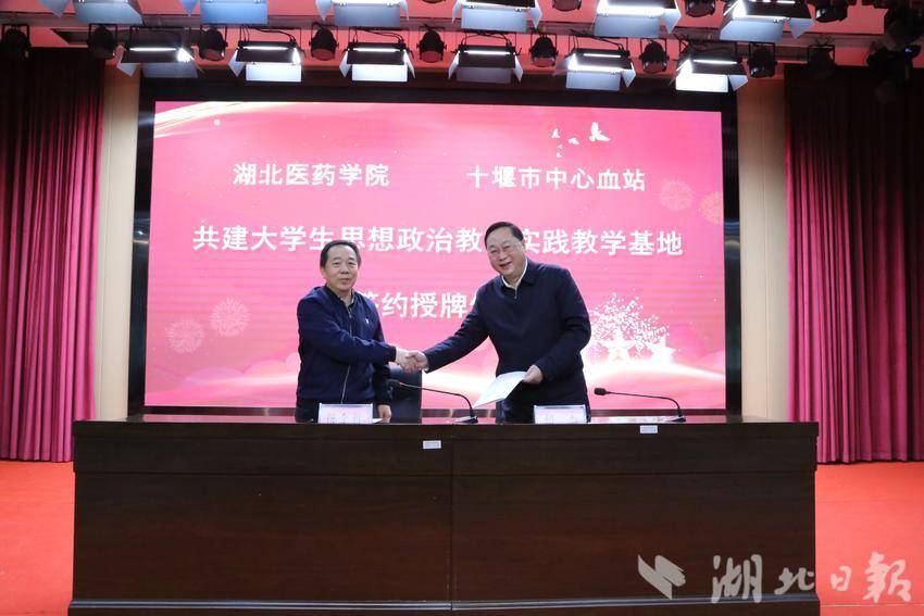 湖北医药学院、市卫健委相关领导,市中心血站领导班子成员和全体干部职工参加仪式。活动现场,校站双方代表共同签订《共建大学生思想政治教育实践基地合作协议》。