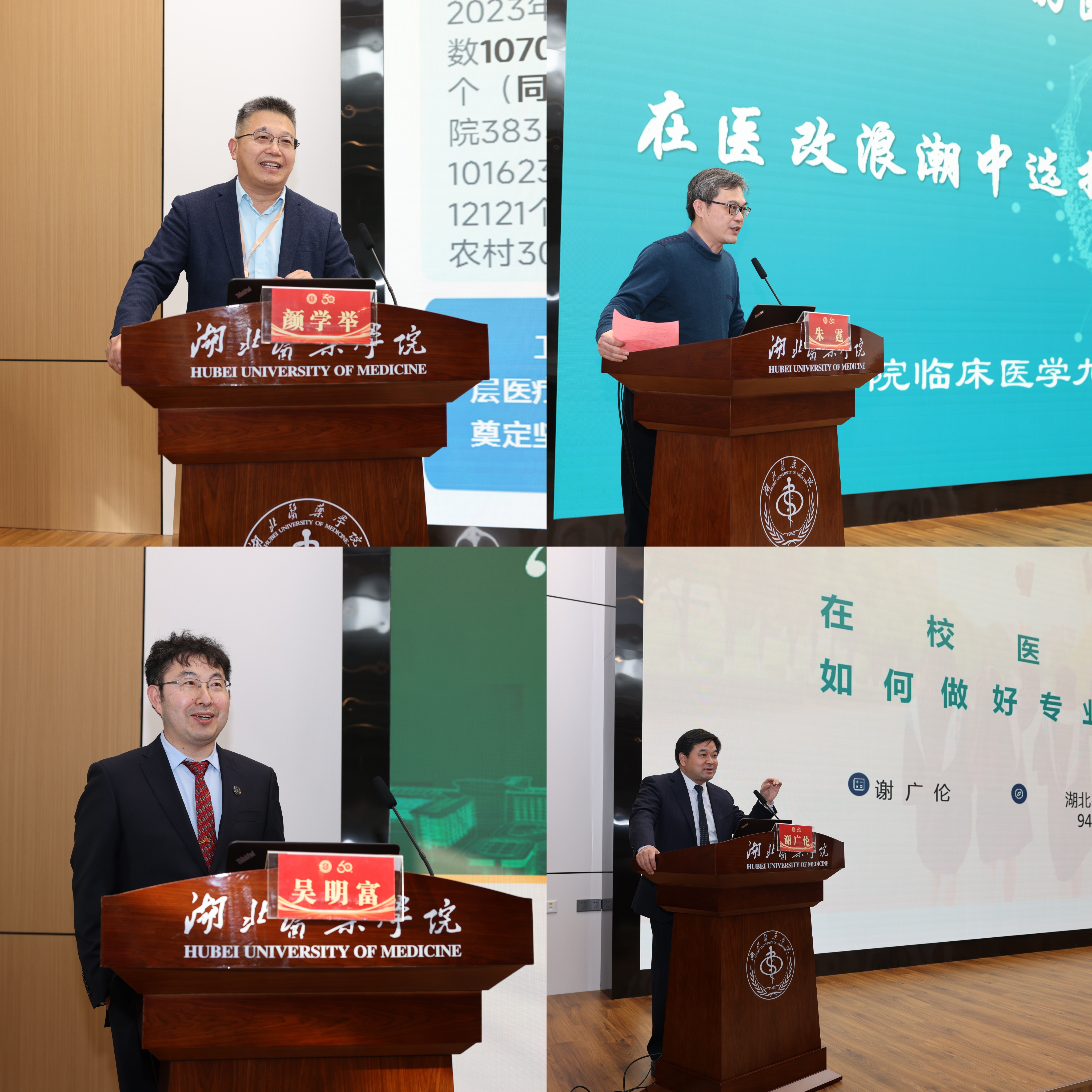 四位校友结合自身深耕领域的丰富经验,分享前沿见解与成长感悟。1992级校友、武汉市公共卫生总师颜学举聚焦“卫生健康事业发展思考与卫生技术人才职业发展探讨”,通过分析卫生健康事业发展基本概况并回顾医改十五年的历程,解读了卫健事业与卫生人才发展趋势并对卫生人才职业发展提出意见建议,引导学子们树立“大卫生、大健康”理念,增强社会责任感。1992级校友、武汉大学人民医院东院耳鼻咽喉头颈外科主任朱霆围绕“不做‘躺平’的医学生--在医改的时代浪潮中选择奔跑”展开分享,以自己的求学和职业生涯为例,激励学弟学妹们积极应对医改浪潮下的机遇与挑战,主动作为,不做“躺平”的医学生。1992级校友、华中科技大学同济医学院附属同济医院妇科常务副主任吴明富以“从山乡到殿堂:一位医学生的‘非典型’进阶之路”为题,分享了自己从母校学子到一名临床工作者的成长历程,引导学子们早做规划,勉励学子们人生路挫折是常态,机会总是留给有准备的人。1994级校友、河南省肿瘤医院疼痛康复与姑息医学科主任谢广伦围绕“在校医学生,如何做好专业规划”主题,通过讲解各专业职业路径、合格的医生必须具备的基本技能、选专业路径的五大考量以及实习、规培和考研如何规划,引导学子们明确方向,做好专业规划,掌握扎实的专业知识和技能,做一个有准备、有竞争力的医学生。