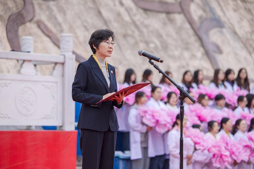 仪式上,湖北医药学院直属附属太和医院表演了歌伴舞《逐梦》,第一临床学院学生献上诗朗诵《秉光铸医魂 辉耀新征程》,诠释了湖医药人追逐医学理想、勇担健康使命的坚定信念。