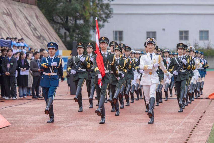 8时,升旗仪式正式开始。校国旗护卫队步伐铿锵,护送国旗庄严入场。伴随着雄壮的《义勇军进行曲》,五星红旗冉冉升起。全体师生肃立注目,齐声高唱国歌。随后,湖北医药学院校旗徐徐升起,象征着学校六十年办学历程的深厚积淀与精神传承。师生同唱校歌,展现了团结一心、砥砺前行的精神风貌。