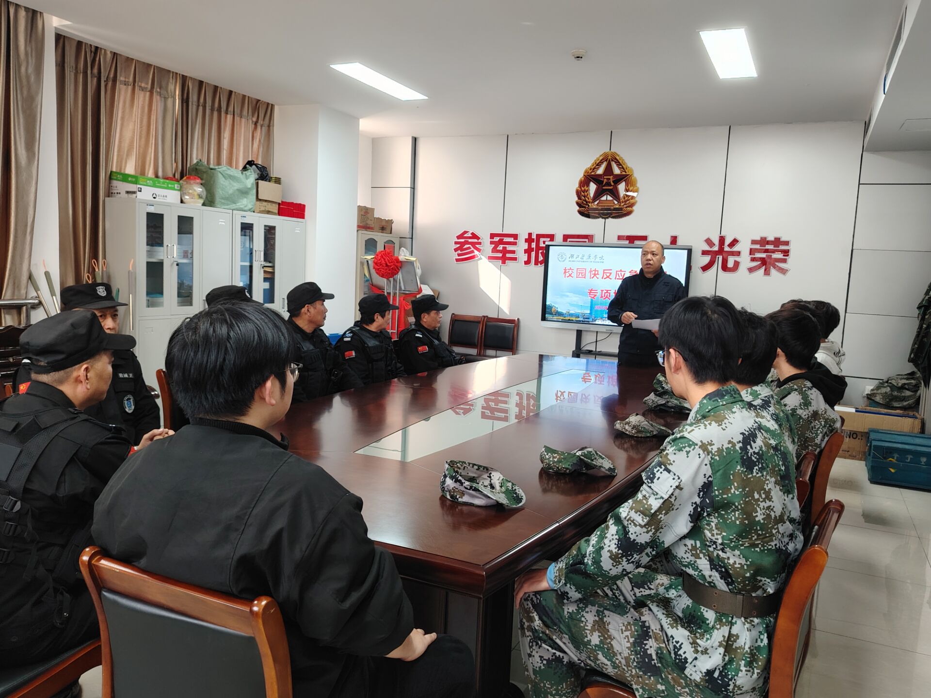 本网讯(通讯员 甘锐)11 月 11 日下午,为全面提升校园安全应急处置的协同化、专业化水平,筑牢校园突发事件防范屏障,学校保卫处牵头应急处突队、消防快反队及学生治保队骨干,在科教楼前广场成功组织开展了应急快反专项培训。