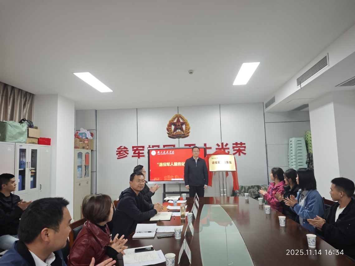 本网讯(通讯员 李良俊 成家洋)11月14日下午,我校退役大学生士兵座谈会暨退役军人服务站揭牌仪式在科教楼518征兵工作站举行。校党委常委、宣传部部长陈建龙出席会议,校武装部、教务处、研究生院、保卫处、后勤处等相关部门负责人与数十名退役复学大学生代表齐聚一堂,共话成长与发展。