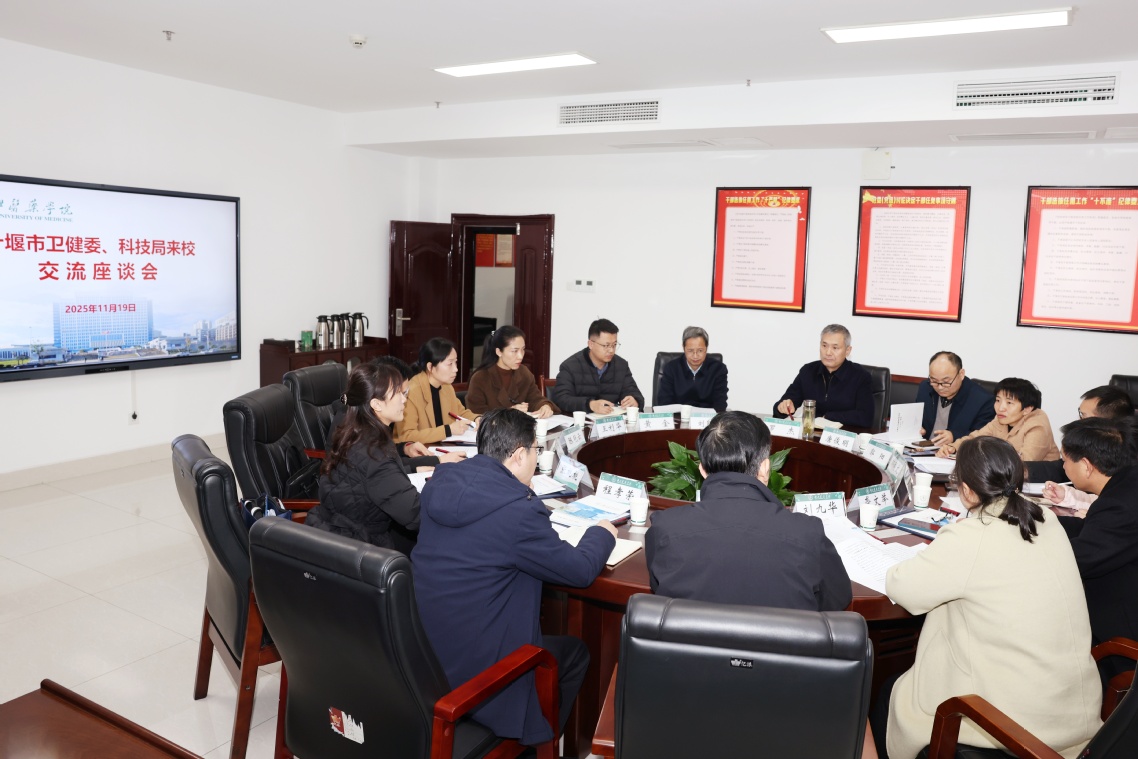 本网讯(通讯员 张桃桃)11月19日下午,十堰市卫健委党组书记、主任潘云峰,市科技局党组书记、局长程孝荣率队到我校座谈交流。校党委副书记、校长罗杰,校党委常委、研究生院院长唐俊明及科技发展研究院、教务处、人事处等相关部门领导参加会议。双方围绕十堰市卫生健康事业发展“十五五”规划编制、深化“医教研”协同融合及重点学科建设等关键领域,进行了深入且富有成效的探讨,共同擘画校地合作新蓝图。
