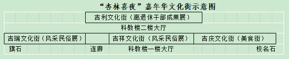 本次活动主要展示中华传统文化,民俗、家乡、美食及留学生风采等。沿科教楼、9号楼通道,打造“杏林喜夜”嘉年华文化街。文化街分为两层,一层设置有“吉庆”、“吉祥”、“吉瑞”文化街,“吉庆”文化街以美食为主、“吉瑞”、“吉祥”文化街主要展示各分工会的风采、民俗。二层设置有“吉利”文化街,主要展示离退休干部成果。文化街布置见下图: