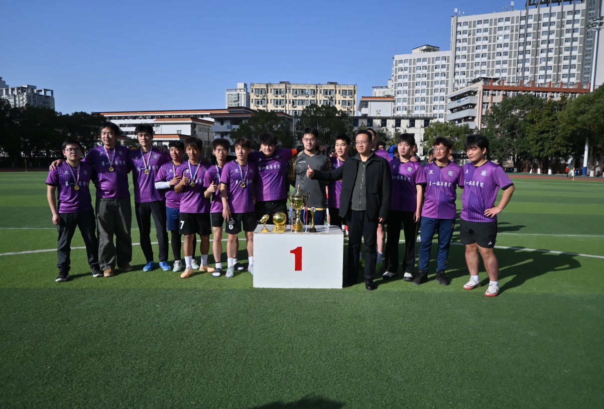 本网讯(通讯员 陈业史 许人卓)11 月 27 日下午,由校团委主办、第四临床学院、国际教育学院与校足球协会联合承办的湖北医药学院 2025 年金秋科技文化艺术节 “奋进杯” 足球赛颁奖仪式在田径场举行。校党委常委、宣传部部长陈建龙,相关学院负责人及全体获奖队员出席闭幕式。