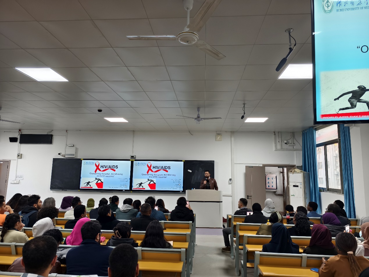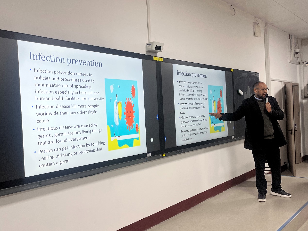 皮肤病与性病学专业研究生PANKAJ NEUPANE和AAKASH KOIRALA分别就艾滋病的历史、传播途径、病原学特征、预防与治疗等方面进行了详细讲解,让同学们全面了解艾滋病,深刻认识防控艾滋病的严峻形势以及预防艾滋病的重要性。神经病学研究生FEYSA NEGASSA GEMEDA从校园环境中的常见传染病,疾病传播链条以及打破传播链条的标准预防措施的角度向现场同学普及了常见传染病预防知识。