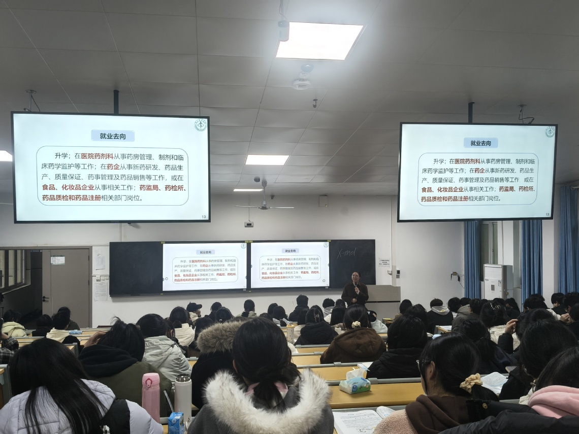 活动伊始,方佳丽以自身求学深造、科研攻关的亲身经历为脉络,结合其博士阶段研究课题的实践案例,为新生们带来了一场兼具理论深度与实践温度的专业解读。针对新生普遍关切的就业发展问题,方佳丽以当前医药行业发展趋势及岗位供需数据为支撑,重点解析了药理学、药剂学、药物分析学、药物化学、药事管理学共五大专业分支的研究方向与应用场景,结合国内外医药企业、科研院所、医疗机构的招聘需求,清晰勾勒出各分支对应的职业发展路径,让新生对专业就业前景有了直观认知。